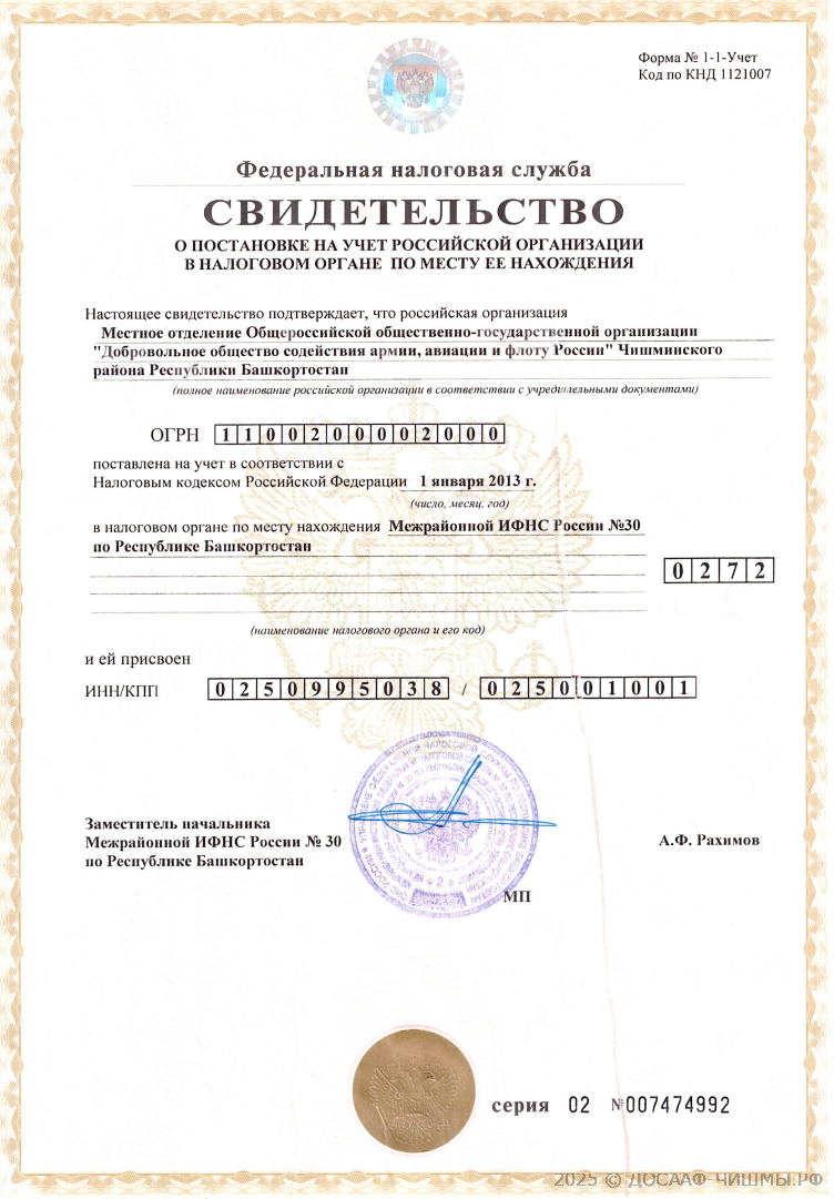 Свидетельство о постановки на учет в Налоговом органе